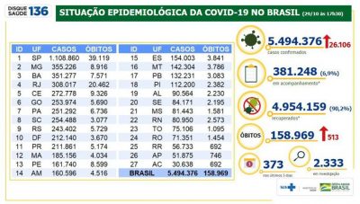 Nas últimas 24 horas, foram registrados 513 óbitos. Ontem, o sistema de dados sobre a pandemia marcava 158.456 mortes geradas pela doença. Ainda há 2.333 falecimentos em investigação.
