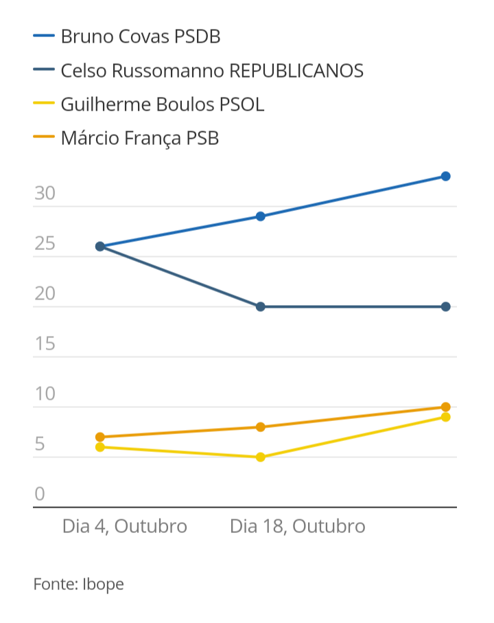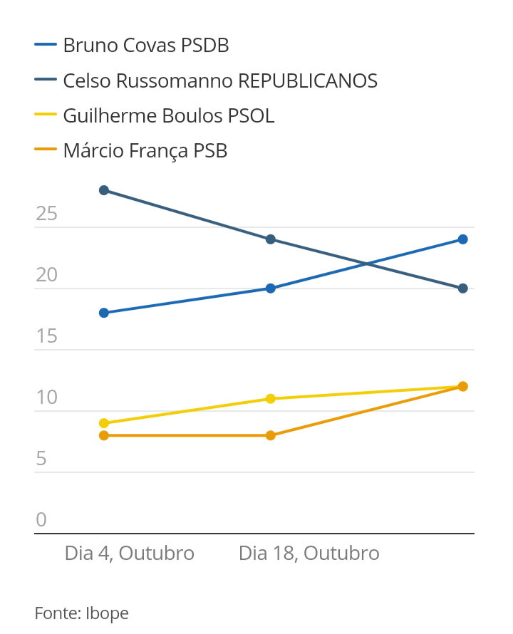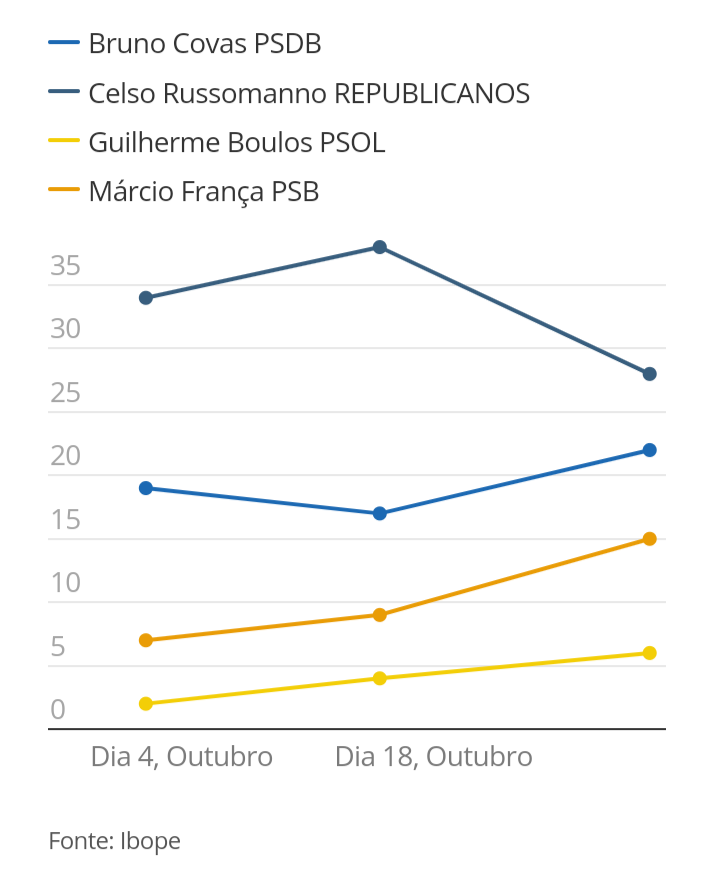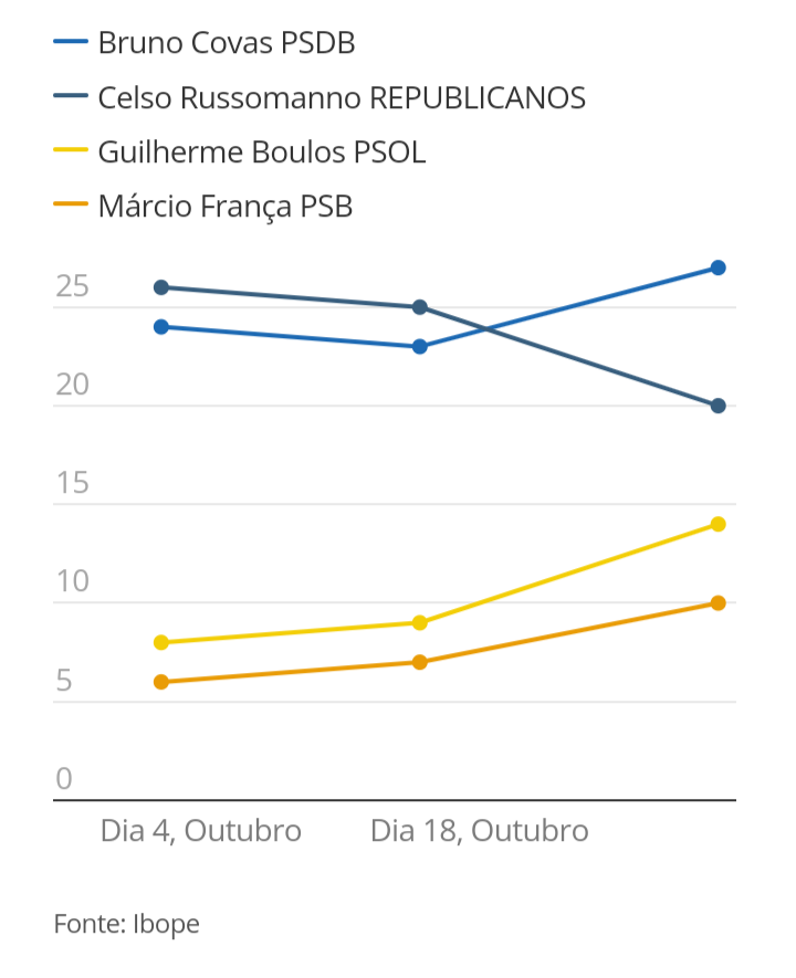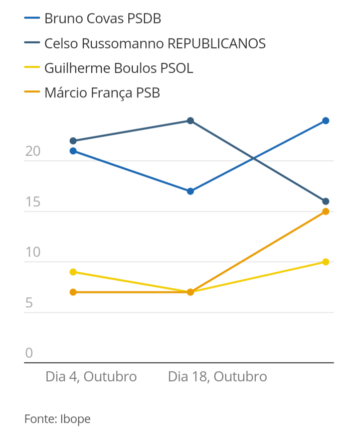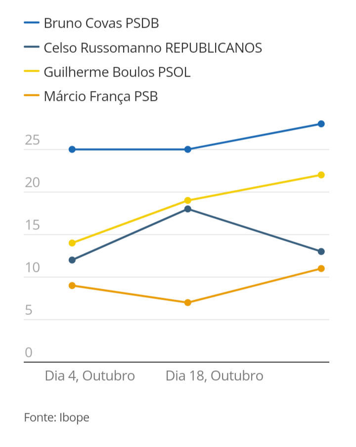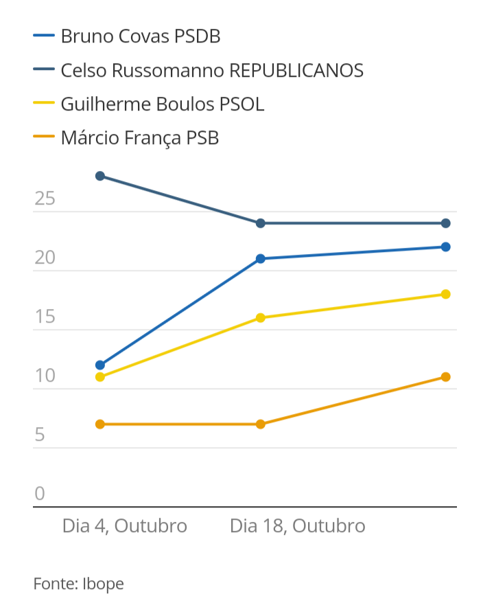 De acordo com o Ibope, enquanto França cresceu oito pontos desde a primeira pesquisa divulgada em 4 de Outubro, Boulos cresceu apenas três pontos.