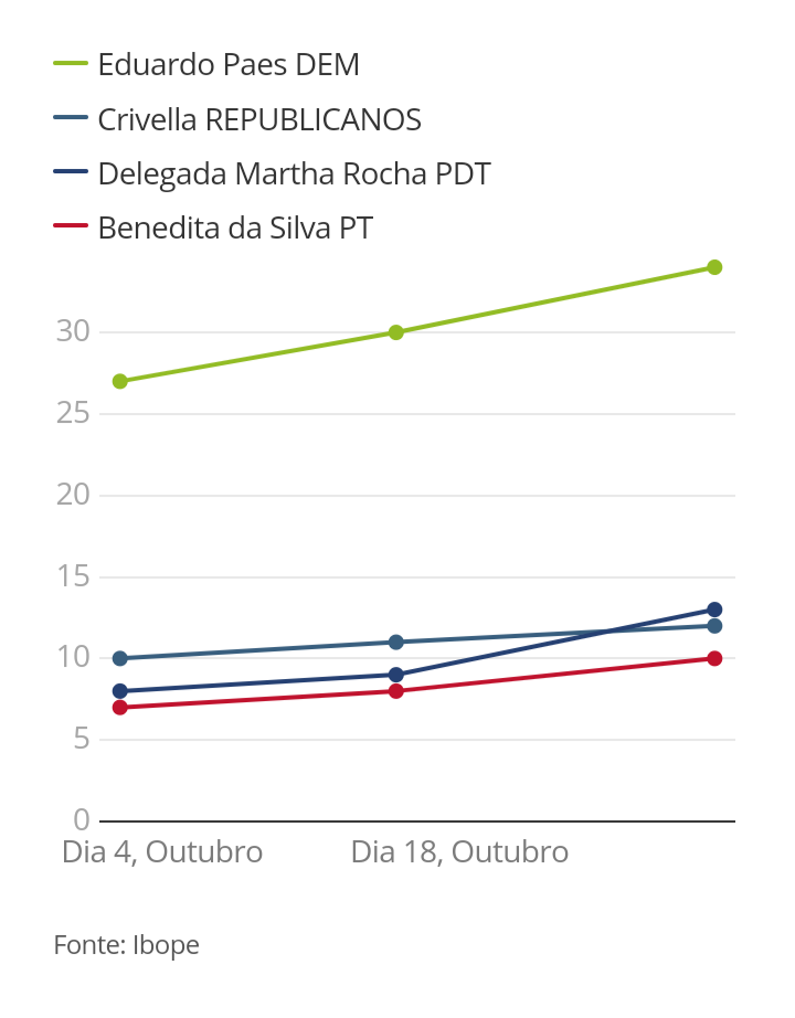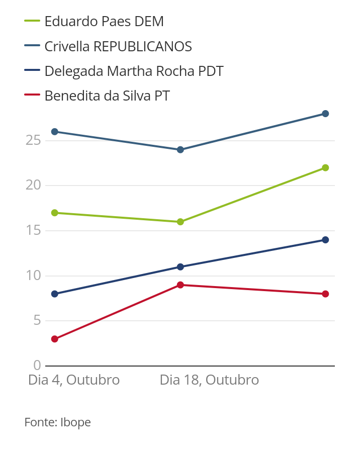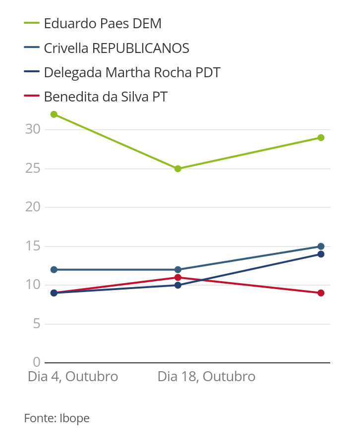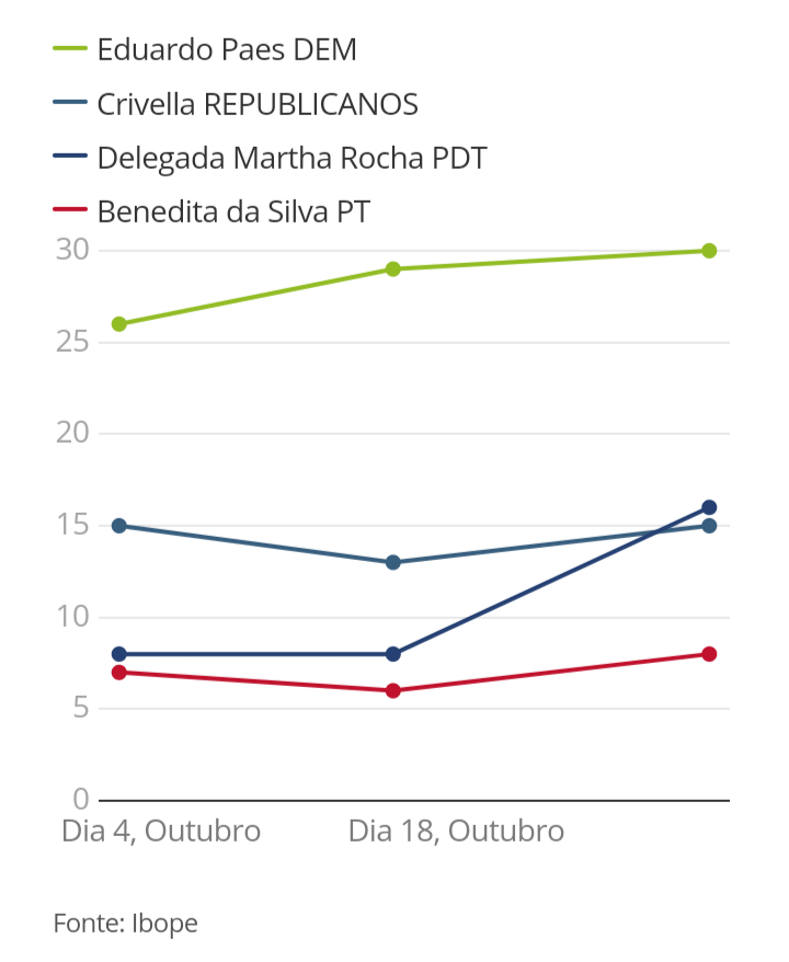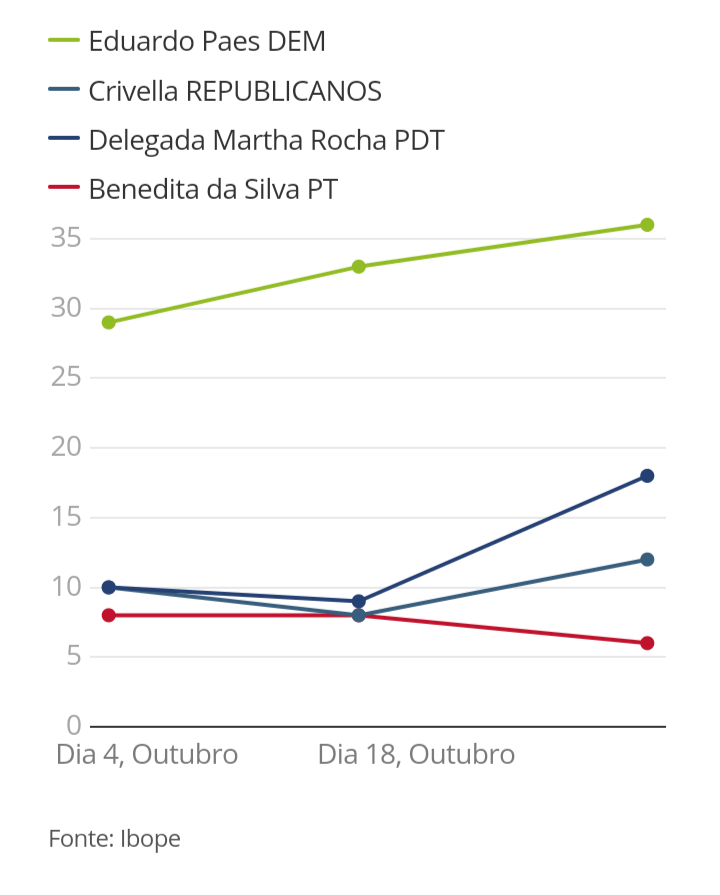 Segundo o Ibope, Martha Rocha cresceu cinco pontos desde a primeira pesquisa eleitoral divulgada pelo Ibope em 4 de Outubro. No mesmo período, Crivella cresceu apenas dois pontos.
