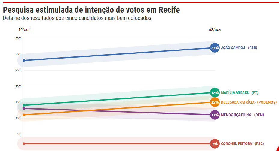 O candidato do PSB, João Campos, subiu quatro pontos e lidera com 32% das intenções, abrindo vantagem de 14 pontos da segunda colocada, a candidata Marília Arraes (PT) que saiu de 14% para 18%.