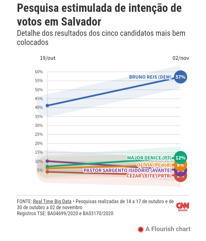 O levantamento mostra o crescimento de 16 pontos do candidato Bruno Reis (DEM) em comparação com a última pesquisa divulgada em 17 de Outubro. Desta vez, o atual vice-prefeito apoiado pelo chefe do executivo soteropolitano, ACM Neto (DEM), aparece com 57% das intenções de voto, garantindo sua liderança isolada na disputa em Salvador.