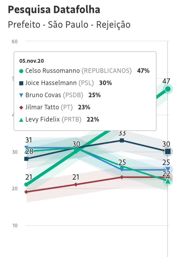 Em queda livre nas pesquisas, Celso Russomano é apoiado pelo presidente Jair Bolsonaro e aparece com 16% das intenções de voto. Além disso, o jornalista também viu seu índice de rejeição explodir para 47%.