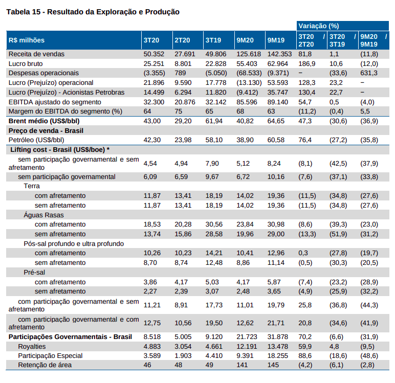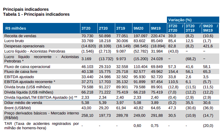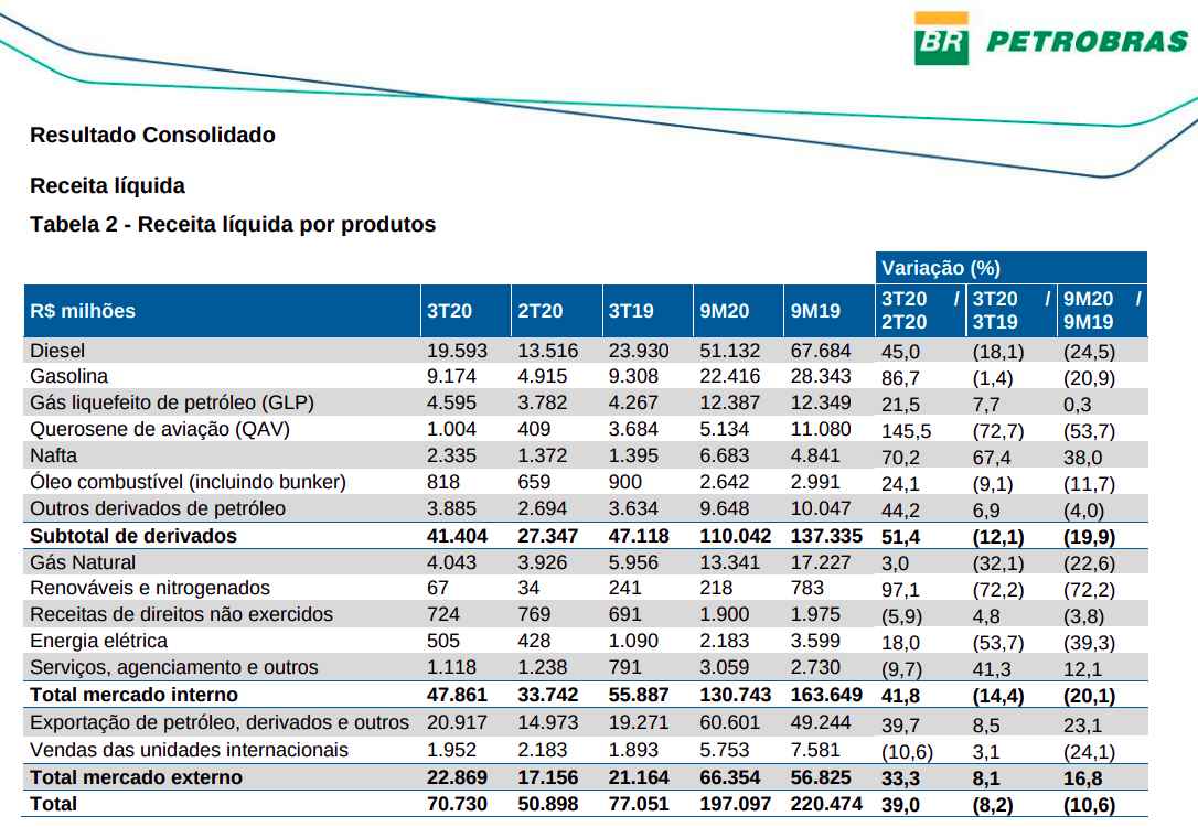 Segundo a tabela que trata do resultado consolidado até o terceiro trimestre, a receita líquida da Petrobras no acumulado dos primeiros nove meses deste ano foi de R$ 130,7 bilhões, com queda de 20% sobre o ano anterior. A queda era inevitável, em função da pandemia. Todas as empresas de petróleo, no mundo inteiro, enfrentaram queda de receita no mesmo período.