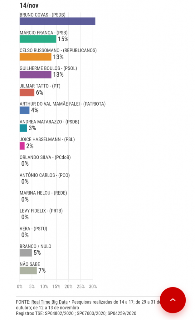 Neste sábado, 14, o Real Time Big Data em parceria com a CNN Brasil divulgou mais uma pesquisa para Prefeitura de São Paulo e mostra a liderança do prefeito Bruno Covas (PSDB) com 35% dos votos válidos. O tucano é seguido pelo candidato Márcio França (PSB) com 17%. Na sequência, aparecem Celso Russomano (Republicanos) e Guilherme Boulos (PSOL) com 15%, cada.