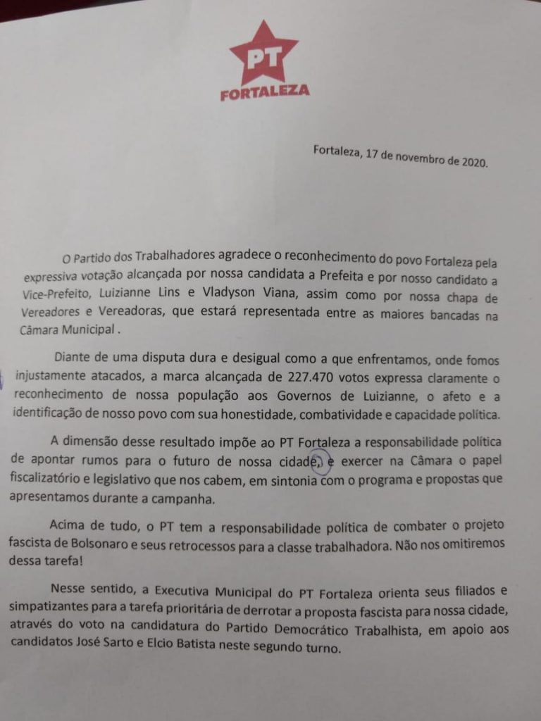 Embora o partido tenha declarado apoio a Sarto, a ex-candidata do PT, Luizianne Lins, continua em silêncio. No 1° turno, a petista ficou com 17% dos votos válidos.