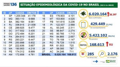 O total de mortes pela doença atingiu 168.613 desde o início da pandemia. Entre ontem e hoje, as autoridades de saúde registraram mais 552 óbitos em função de infecções por coronavírus. Ontem, a totalização estava em 168.061 mortes pela doença causada pelo novo coronavírus. Ainda há 2.176 óbitos em investigação.