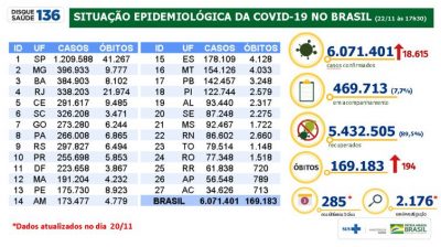 Agência Brasil — O balanço divulgado hoje (22) pelo Ministério da Saúde indica o acréscimo de 18.615 novos casos de covid-19 nas últimas 24 horas. No acumulado desde o início da pandemia já são 6.071.401 casos. Além disso, foram registradas 194 novas mortes, totalizando 169.183 óbitos. Além disso, 5.432.505 pessoas (89,5%) já estão curaram da doença.