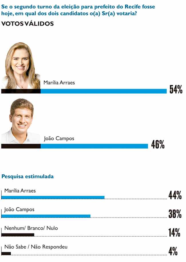 “(…) Na primeira pesquisa de intenções de voto para o segundo turno da disputa pela Prefeitura do Recife, realizada pelo Instituto de Pesquisas Sociais, Políticas e Econômicas (Ipespe) em parceria com a Folha de Pernambuco, Marília Arraes (PT) aparece com 54% dos votos válidos (excluídos os brancos e nulos) e João Campos (PSB), com 46%. A margem de erro máximo estimada do estudo é de 3,5 pontos percentuais para mais ou para menos, com a utilização de um intervalo de confiança de 95,45%.