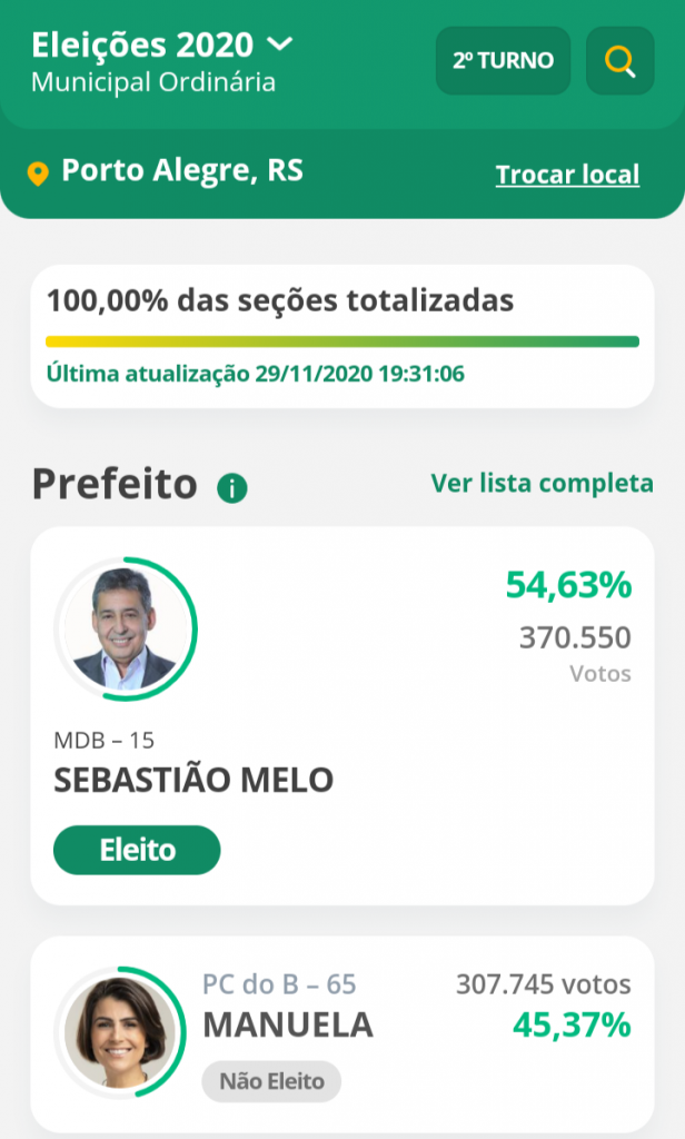 Com 100% das urnas apuradas, o candidato Sebastião Melo (MDB) foi eleito prefeito de Porto Alegre com 54,6% dos votos válidos. Manuela D’Ávila (PC do B) tirou 45,3%.