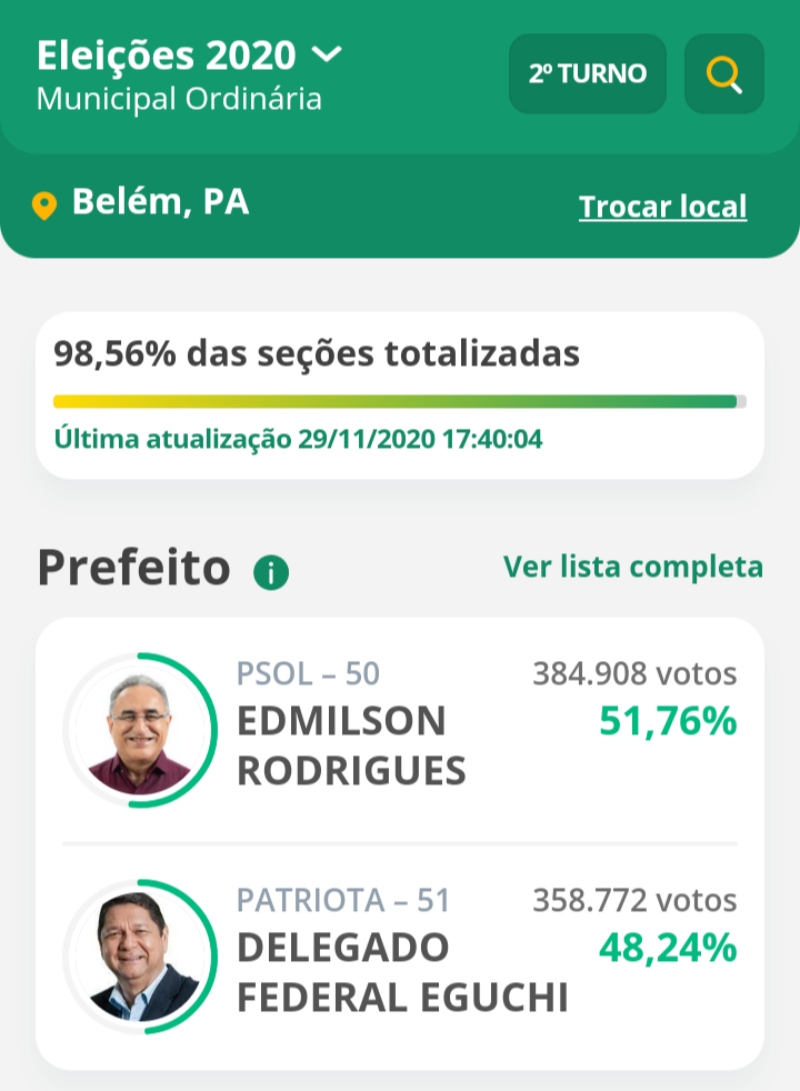 Com 98,5% das urnas apuradas e 51,7% dos votos válidos, Edmilson Rodrigues (PSOL) é eleito prefeito de Belém. Apoiado pelo presidente Jair Bolsonaro, Delegado Eguchi ficou com 48,2%.