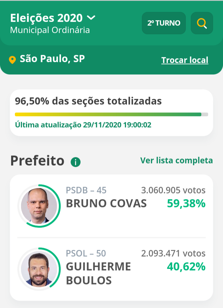 Com 96,5% das urnas apuradas e 59,3% dos votos válidos, Bruno Covas (PSDB) é reeleito prefeito de São Paulo. Competitivo na disputa, Guilherme Boulos (PSOL) ficou com 40,6%.