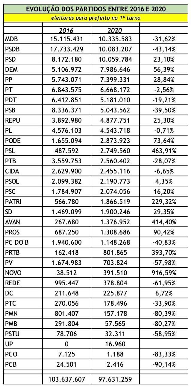 Pode-se olhar para os números, a partir dos números de prefeituras e vagas de vereador conquistadas, pela votação dos diferentes partidos, independente das vitórias obtidas, nas eleições proporcionais ou majoritárias – e para a magnitude das populações a serem administradas. Deve-se levar em conta ainda o tamanho relativo dos partidos em cada grande cidade, estado ou região. Podemos também avaliar o desempenho dos partidos segundo o tamanho das cidades: com menos de 50 mil habitantes, entre 50 e 150 mil, entre 150 mil e 500 mil, e mais de 500 mil habitantes. Há, por fim, uma “taxa de sucesso” de cada partido, que deve ser considerada: qual o percentual de eleitos no total de candidatos?