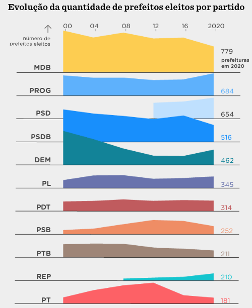 Vamos olhar a evolução da quantidade de prefeitos eleitos por partido. Neste tipo de avaliação, os pontos que merecem destaque são: