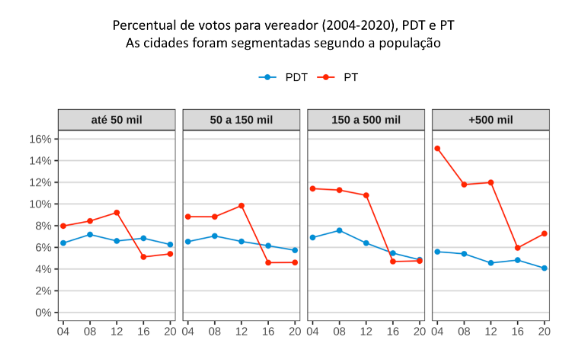 No primeiro, vemos as votações de PT e PDT nos quatro grupos de cidades. Nos dois primeiros grupos, cidades pequenas e cidades médias, o PDT segue à frente do PT. No grupo de cidades médias-grandes (150 a 500 mil habitantes), os partidos seguem empatados, e nas cidades grandes (mais de 500 mil habitantes), o PT experimentou uma recuperação, ao passo que o PDT registrou o seu pior desempenho desde 2004. Aliás, o desempenho do PDT, de maneira geral, em termos de votação para campanhas proporcionais de vereador, foi um dos piores de sua história recente.