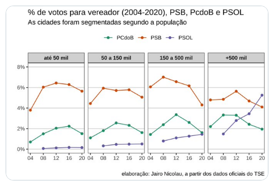 - O outro gráfico, com o desempenho de PSB, PCdoB e PSOL mostra que o PSB experimentou um movimento parecido ao do PDT, obtendo inclusive os mesmos 4% dos votos para vereador nas cidades médias-grandes e grandes registrados pelos trabalhistas, também o pior desempenho do PSB na história recente. Nas grandes cidades, o destaque vai para o crescimento incrível do PSOL a cada eleição, ultrapassando o PSB.