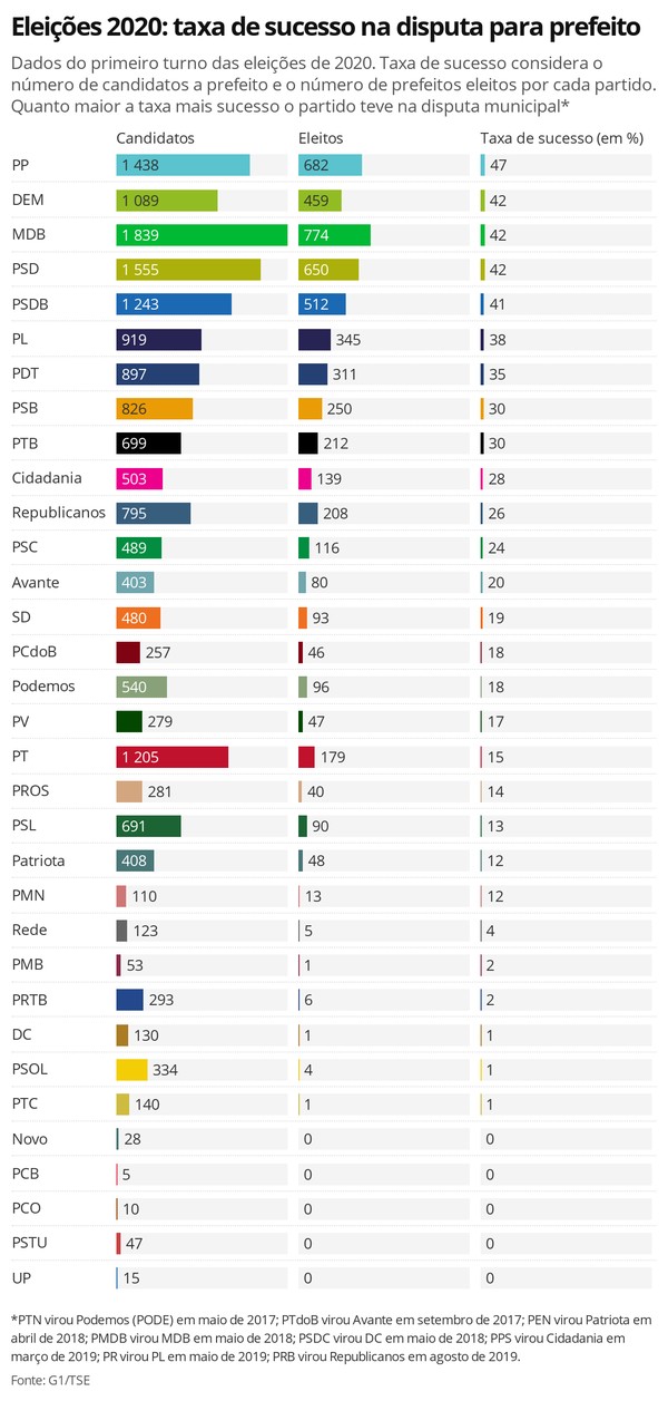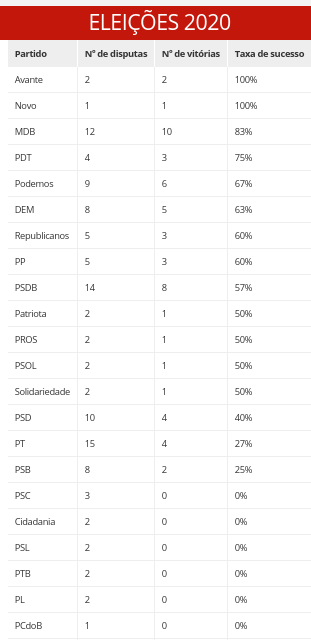 Outro ponto que merece atenção é a taxa de sucesso dos candidatos eleitos, porque ela nos ajuda a medir o grau de aceitação ou rejeição de cada partido.