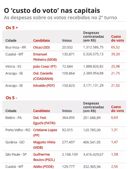 O G1 fez ainda uma relação entre os gastos contratados e os votos alcançados no segundo turno, de todos os candidatos de capital.