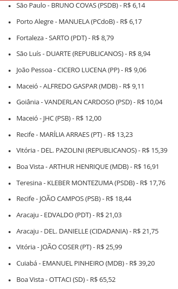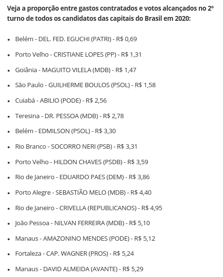 Outro ponto que merece ser considerado é o custo relativo das campanhas. Alguns candidatos receberam muitos recursos, e não apresentaram bons resultados.