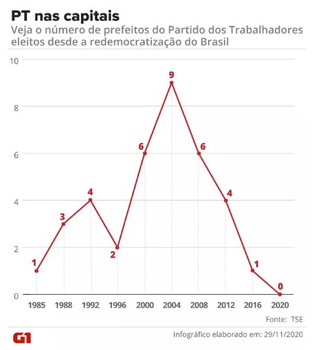 - Tombo do PT: o partido que chegou a ter 630 prefeituras em 2012, incluindo a de São Paulo, que ganhou 4 eleições presidenciais sucessivamente, sai dessas eleições municipais governando apenas 183 cidades, entre as quais, nenhuma capital.