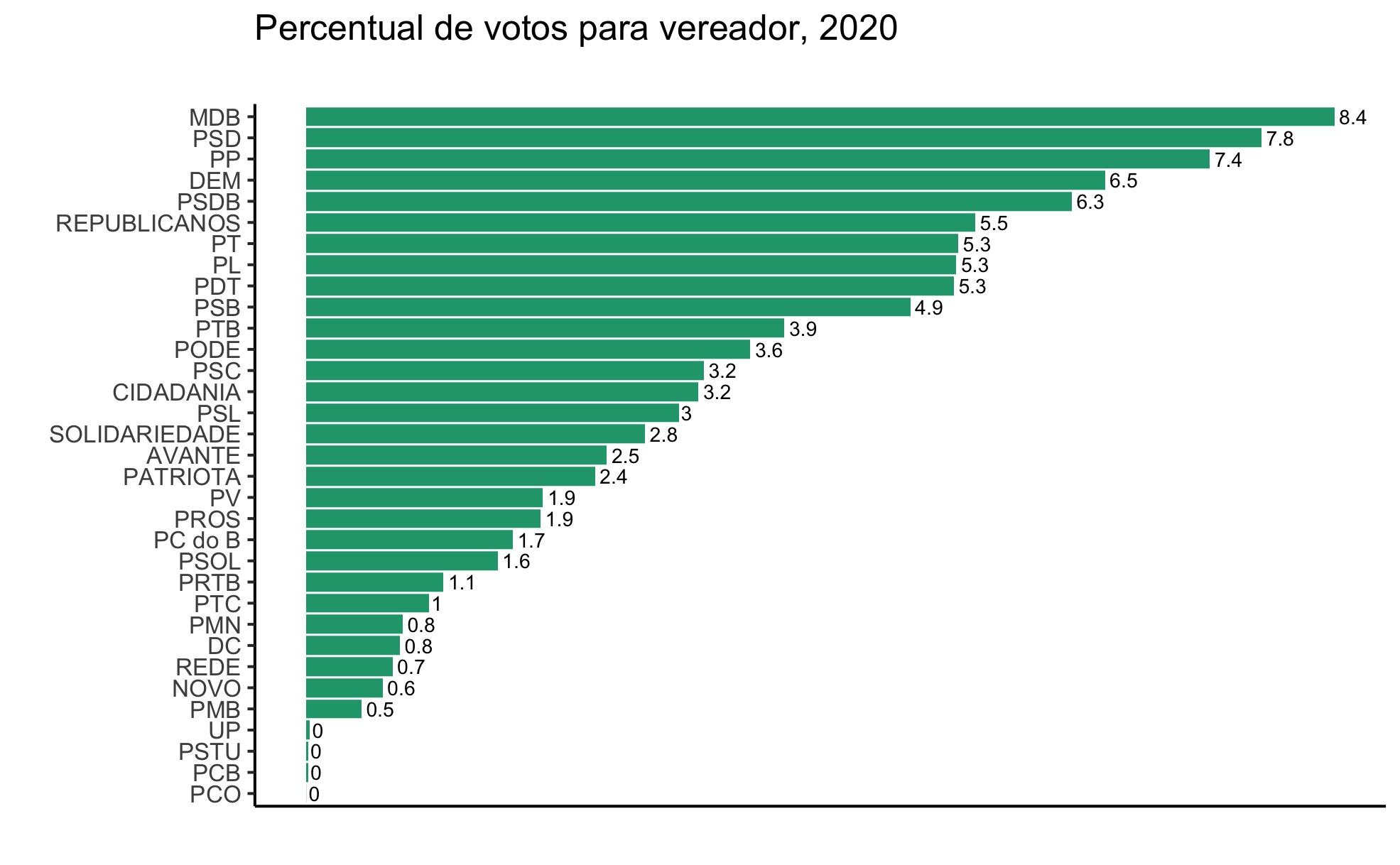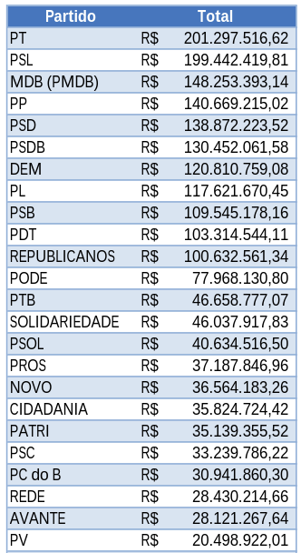 Primeiramente, vamos lembrar quanto cada partido ganhou. A notícia abaixo, publicada em setembro de 2020 no site do TSE, traz uma relação atualizada.