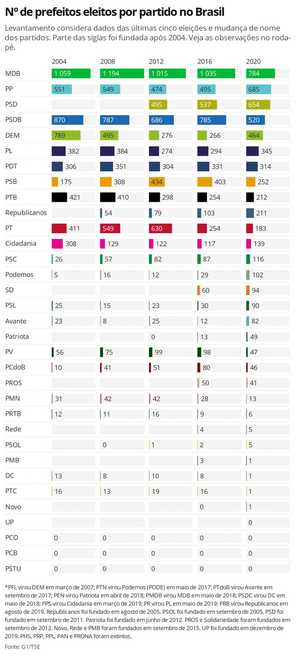 - O PSOL experimentou um forte aumento no número de prefeitos, mas ainda é uma legenda nanica, neste quesito, com apenas 5 administrações. No entanto, ganhou uma capital importante, Belém, e chegou ao segundo turno de São Paulo, com Guilherme Boulos, e isso já é mais do que o PT conseguiu.