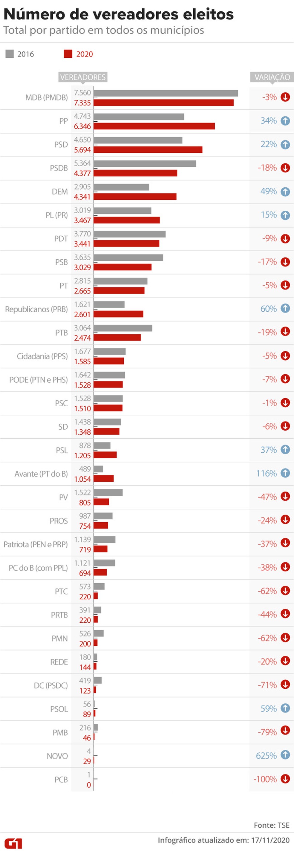 Neste quesito, os principais partidos progressistas são PDT, PSB, PT. Os três partidos registraram queda, de 9%, 17%, e 5%, respectivamente. Assim como se viu no número de prefeituras, o PDT agora também lidera no ranking de vereadores, com 3.441 eleitores, seguido de PSB, 3.029 e PT, com 2.665.
