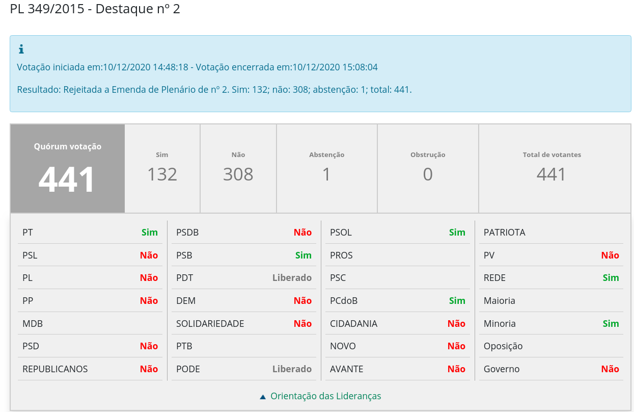A emenda causou polêmica e foi rejeitada por 308 X 132 votos. Segundo a autora da proposta, Rosângela Gomes, a emenda seria um “jabuti”.