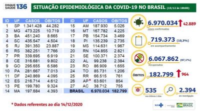 Conforme a atualização do órgão, há 719.373 pacientes em acompanhamento. No total, 6.067.862 pessoas se recuperaram da doença.