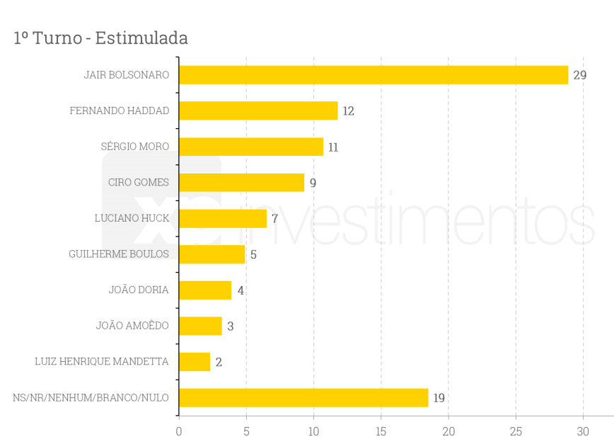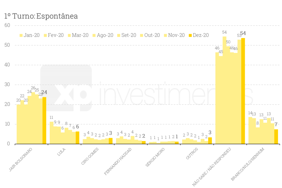 A Ipespe também divulgou uma pesquisa espontânea, na qual temos Bolsonaro com 24%, Lula 6%, Ciro 3%, Haddad 2% e Sergio Moro 1%.