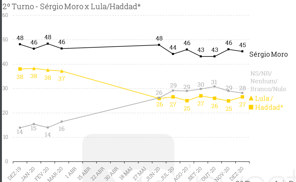 Até que Moro ainda está “bem na fita”, pois, fora do cenário político há meses, é o único que poderia vencer Bolsonaro no 2º Turno, desses elencados acima. Notem que ele atingiu seu pico de apoio em abril deste ano (não por acaso)! Fatos políticos podem alavancá-lo…