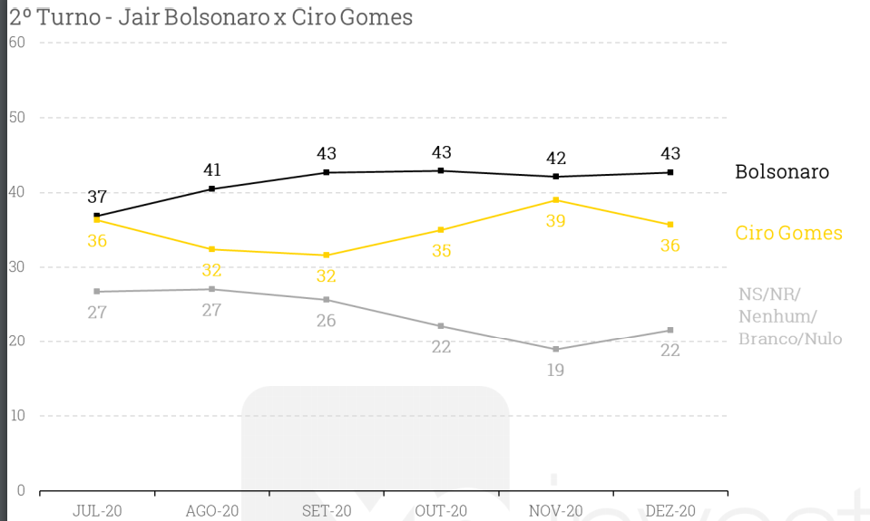 Ciro continua na mesma: seus percentuais oscilam entre 8 e 12% desde o início da série; hoje está em 9%, um ponto a mais do que em novembro.