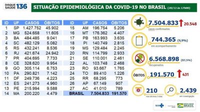 Agência Brasil — O Brasil ultrapassou a marca de 7,5 milhões de casos de covid-19. Com 20.548 novos diagnósticos positivos da doença registrados nas últimas 24 horas, o país chegou a 7.504.833 pessoas infectadas desde o início da pandemia do novo coronavírus. No domingo (27), o painel do Ministério da Saúde trazia 7.484.285 casos.