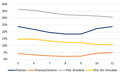 A redução do Auxílio Emergencial é um fator que, além de puxar a queda da renda média, também tem grande efeito sobre a pobreza, principalmente por estar concentrada entre a população mais pobre do país. Pode se observar que, nas últimas duas edições, a pobreza e pobreza extrema tiveram grandes aumentos, chegando a 23,9% e 5%. Seguindo a metodologia de simulação do Bolsa Família do texto de julho de 2020[1], observa-se também que estas teriam continuado sua trajetória de queda sem o Auxílio Emergencial ao longo dos meses, ainda que em nível maior, de 30,7% e 10,7%, respectivamente.