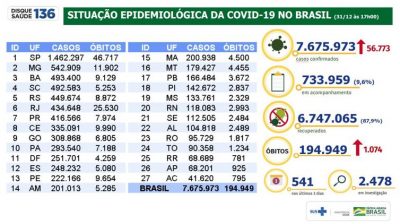 O total de casos acumulados chegou a 7.675.973. Entre ontem e hoje, foram registrados 56.773 novos diagnósticos positivos. Até ontem, o painel da covid-19 trazia 7.619.200 casos acumulados.