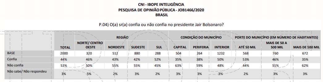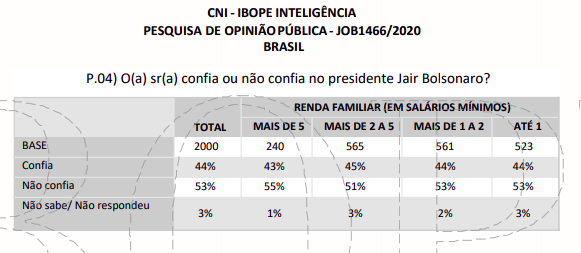 Entre os segmentos sociais que mais rejeitam Bolsonaro estão: jovens até 24 anos (64% não confiam); eleitores com nível superior (58% não confiam); residentes em capital (63% não confiam); residentes em cidades com mais de 500 mil habitantes (62% não confiam).