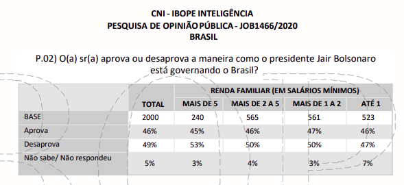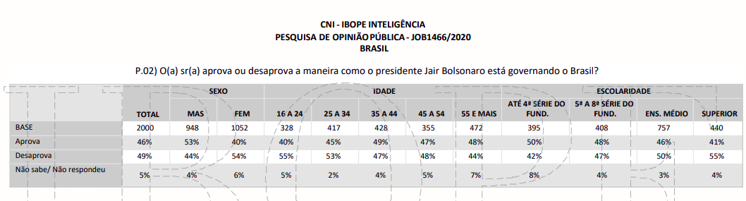 A aprovação à maneira como o presidente Bolsonaro governa o país também está negativa. Segundo o Ibope, 49% desaprovam Bolsonaro, contra 46% que aprovam. Mais uma vez, há grande diferença entre os gêneros: entre homens, a aprovação ao governo é de 53%, contra 40% de desaprovação, ao passo que, entre mulheres, os números se invertem, com 44% de desaprovação e 54% de desaprovação.