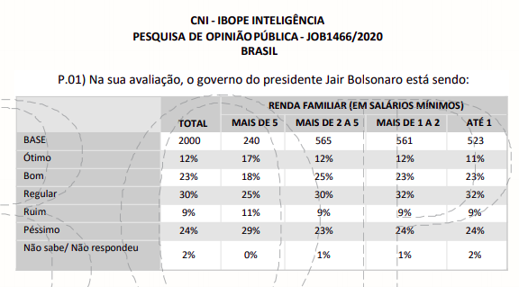 Quanto às notas de avaliação do governo, há maior polarização junto às famílias com renda média acima de 5 salários: neste segmento, 17% acham “ótimo” o governo Bolsonaro, nota maior do que se vê em faixas de renda inferiores, mas outros 29% dão nota “péssimo”, o que também é superior ao visto em outras faixas. Como se vê, porém, a rejeição é maior do que a aprovação.