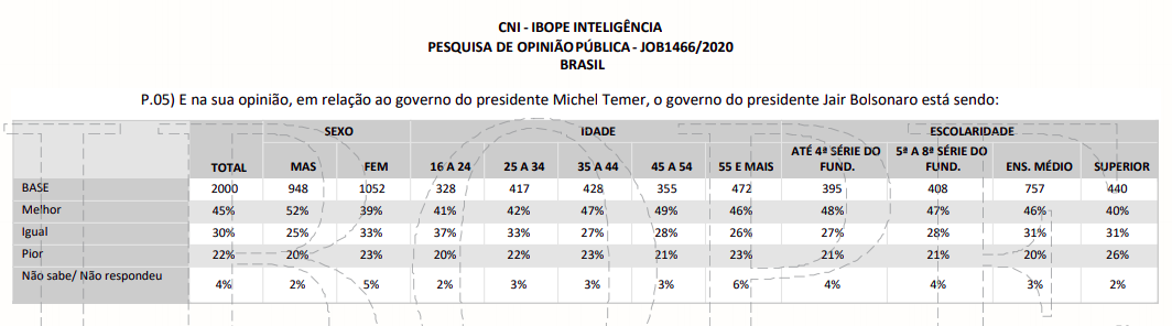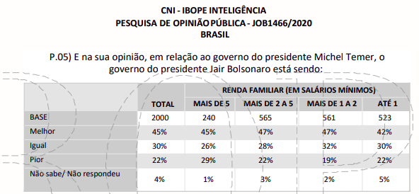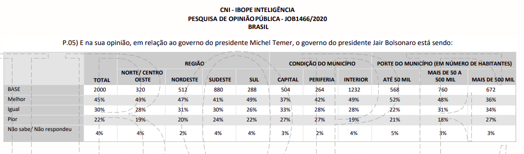 É interessante verificar ainda que, para 55% dos brasileiros, o governo Bolsonaro é pior ou igual ao de Michel Temer.