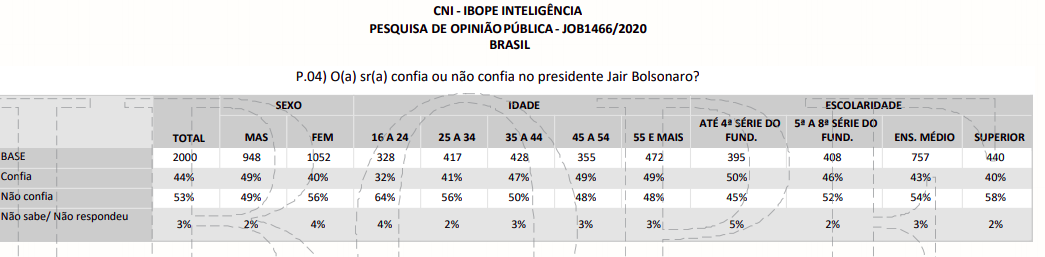 Uma característica do apoiador de Bolsonaro ainda não mudou, todavia: entre homens, o presidente tem confiança de 49%, contra 40% entre mulheres. Mas outros 49% dos homens dizem não confiar no presidente, percentual que cresce para 56% entre mulheres.