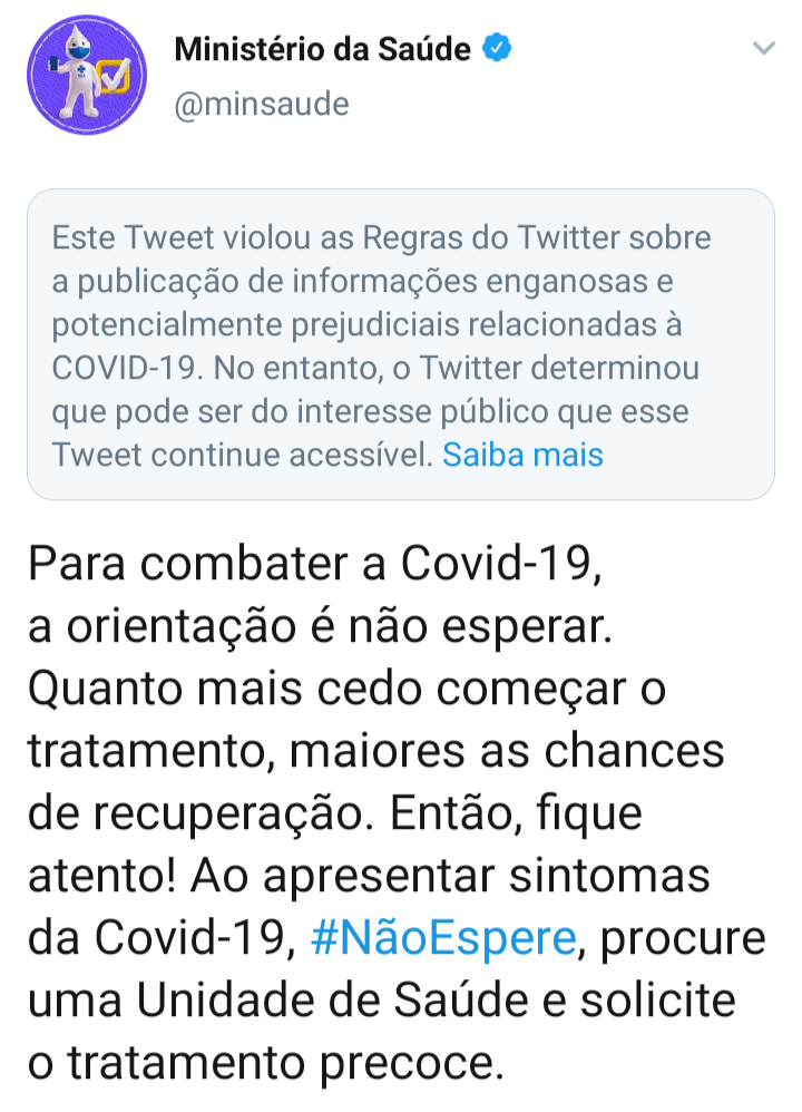 Na noite deste sábado, 16, o Twitter emitiu um sinal de alerta de informação falsa numa publicação feita pelo Ministério da Saúde.
