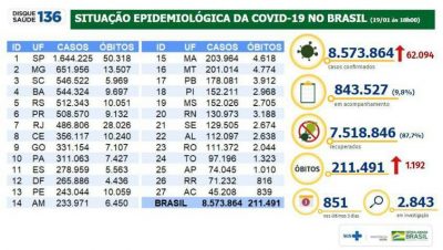 Com os novos óbitos, o total de vidas perdidas para a pandemia subiu para 211.491. Ontem, o painel do Ministério da Saúde trazia 210.299 mortes. Ainda há 2.843 falecimentos em investigação por equipes de saúde.
