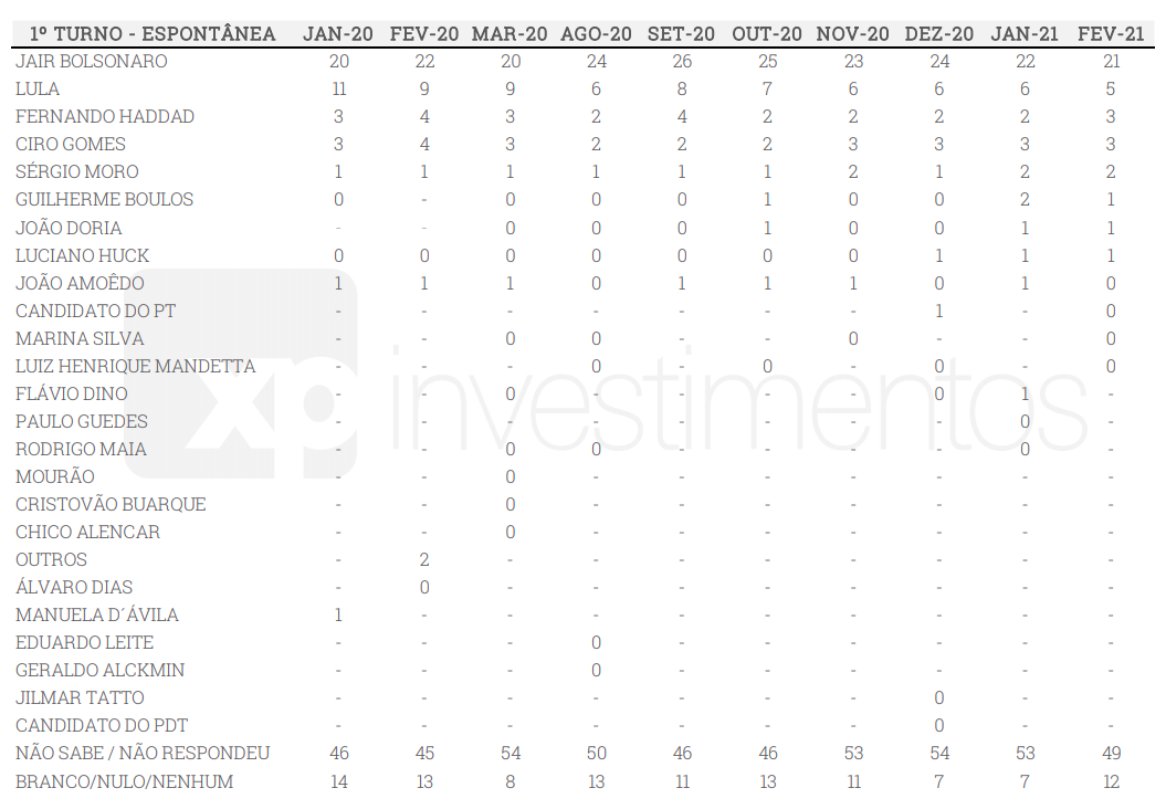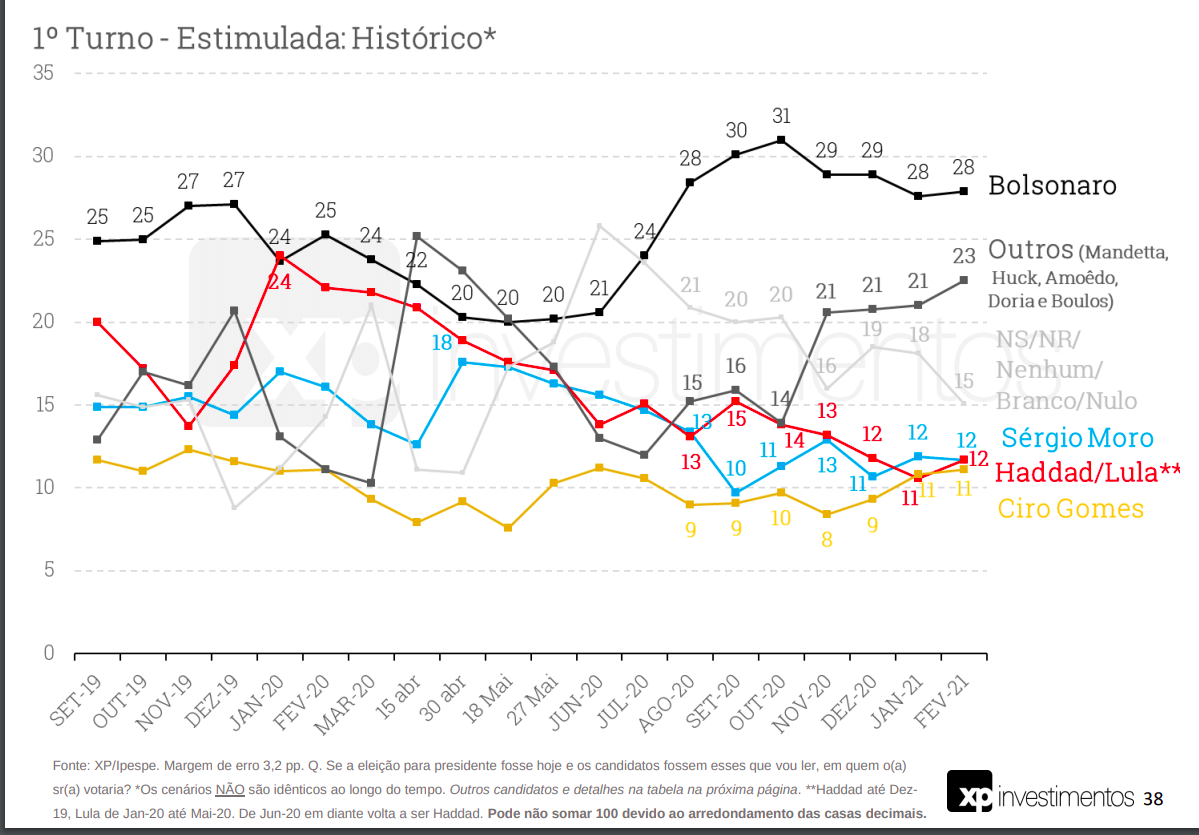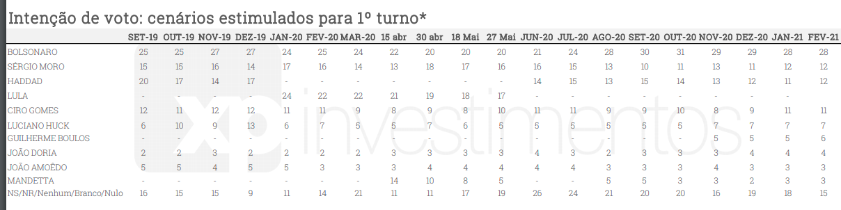 Entretanto, o que há de mais interessante na pesquisa XP/Ipespe são os cenários de primeiro e segundo turno para as eleições de 2022.