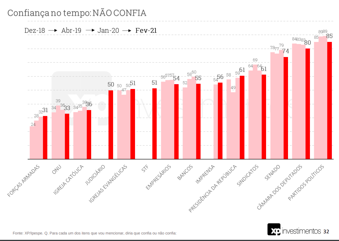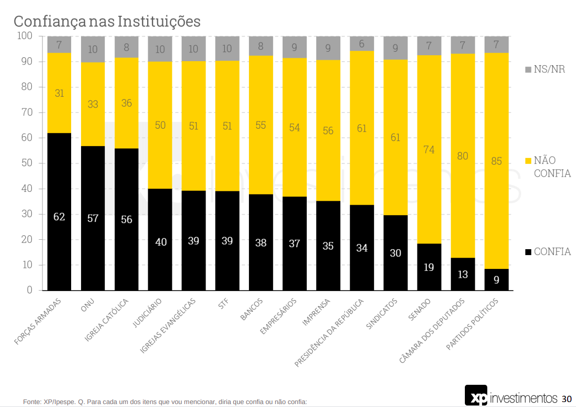 - A Câmara dos Deputados também apresenta números ruins de confiança: 80% disseram NÃO confiar na instituição.