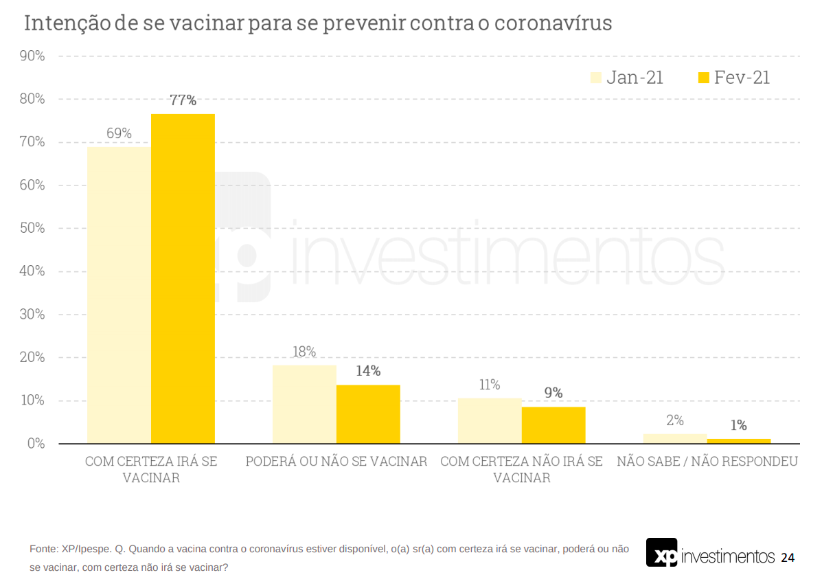 Conforme previsto, o percentual de pessoas dispostas a se vacinar disparou, puxado pelo bom benso, que foi por sua vez despertado pelas imagens na TV das pessoas se vacinando. Segundo a pesquisa, o percentual das pessoas que responderam que “com certeza irão se vacinar” saltou de 69% para 77% em 30 dias.