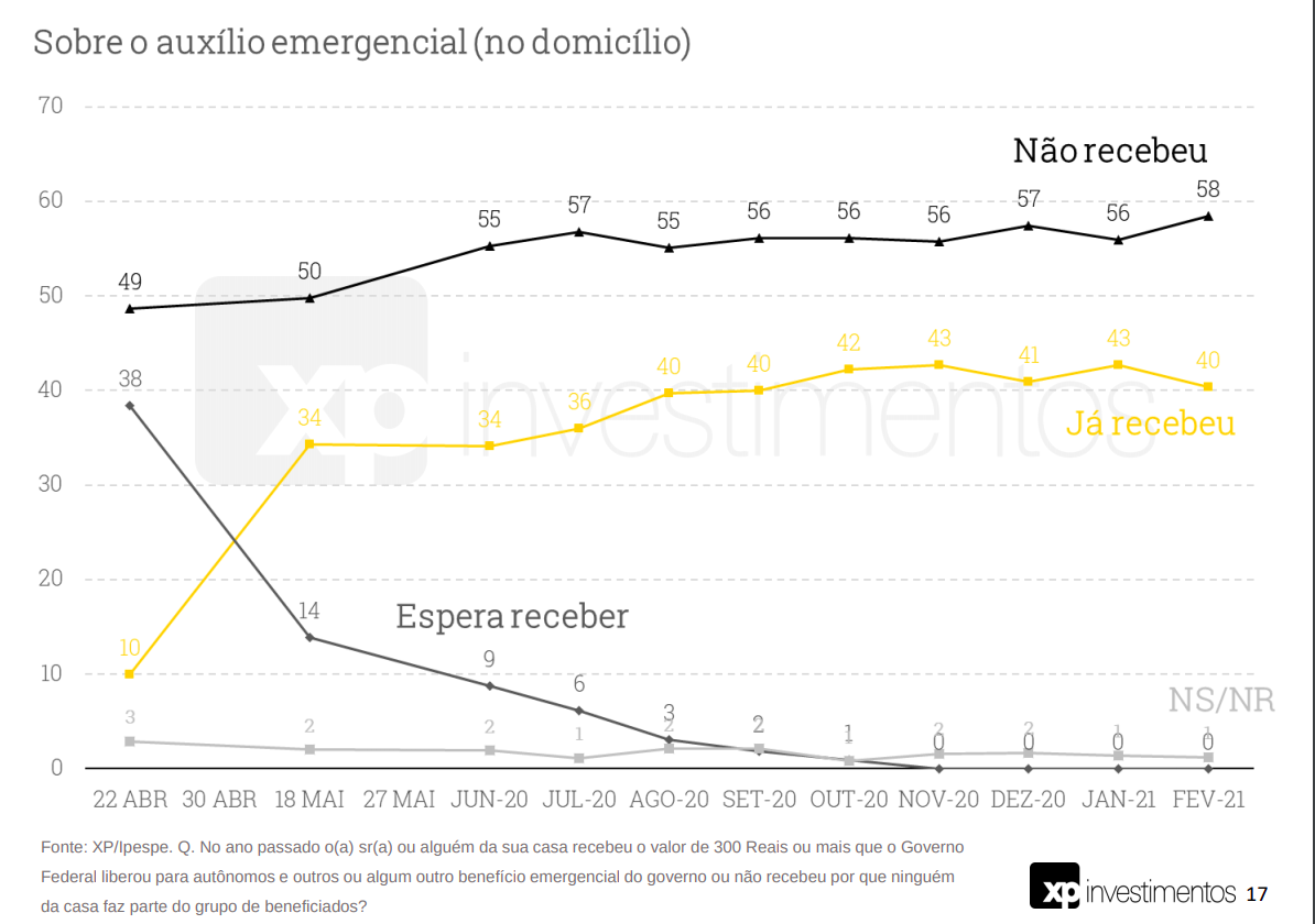 O gráfico mostra que 58% da população não recebeu auxílio emergencial, ou seja, mesmo que este volte a ser pago (é provável que o seja, embora com valor menor), ainda haverá um largo contingente da população que não o recebe e que, portanto, espera políticas mais efetivas de geração de emprego.