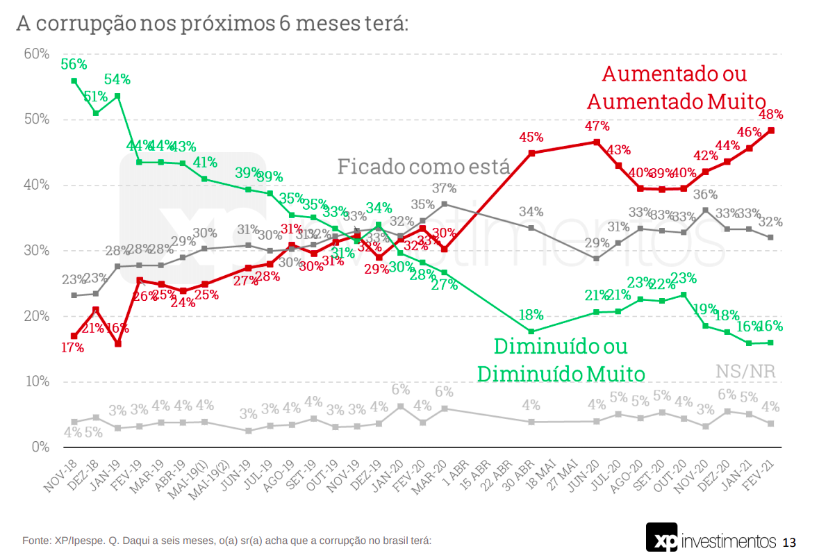 Outro fator negativo para o governo é o aumento da expectativa de corrupção, que subiu para 48%, o maior nível desde o início do governo. Observe a evolução do gráfico. Ele mostra um processo de erosão constante da imagem do governo Bolsonaro como aquele que iria combater efetivamente a corrupção no país.