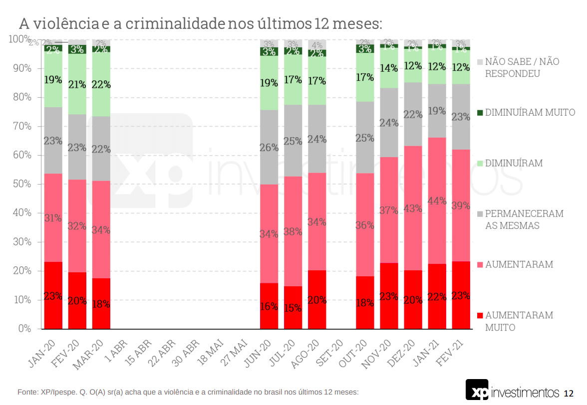 Observe que a população não percebeu melhora expressiva da violência e criminalidade no país: 85% dos entrevistados responderam que esses dois problemas aumentaram muito, ou aumentaram ou permaneceram os mesmos. Um percentual insignificante de 1% disse que “diminuiram muito”, e apenas 12%, que diminuiram.