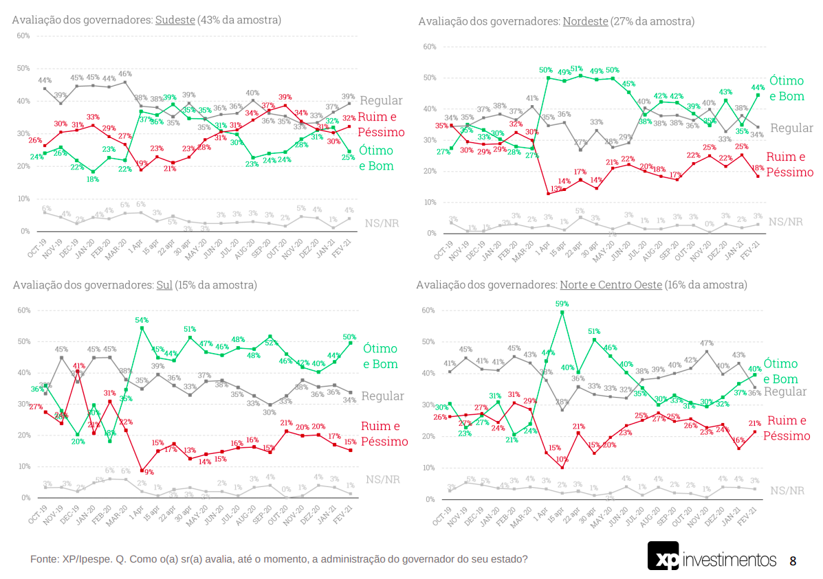 A aprovação dos governadores é bastante diferente segundo a região. No Nordeste, houve melhora expressiva na aprovação, com as notas de ótimo e bom representante 44%. Ou seja, os governadores do nordeste detêm muito mais aprovação que o presidente Bolsonaro, que tem apenas 30%. As notas ruim e péssimo dos governadores do Nordeste, por sua vez, caiu para 18%.