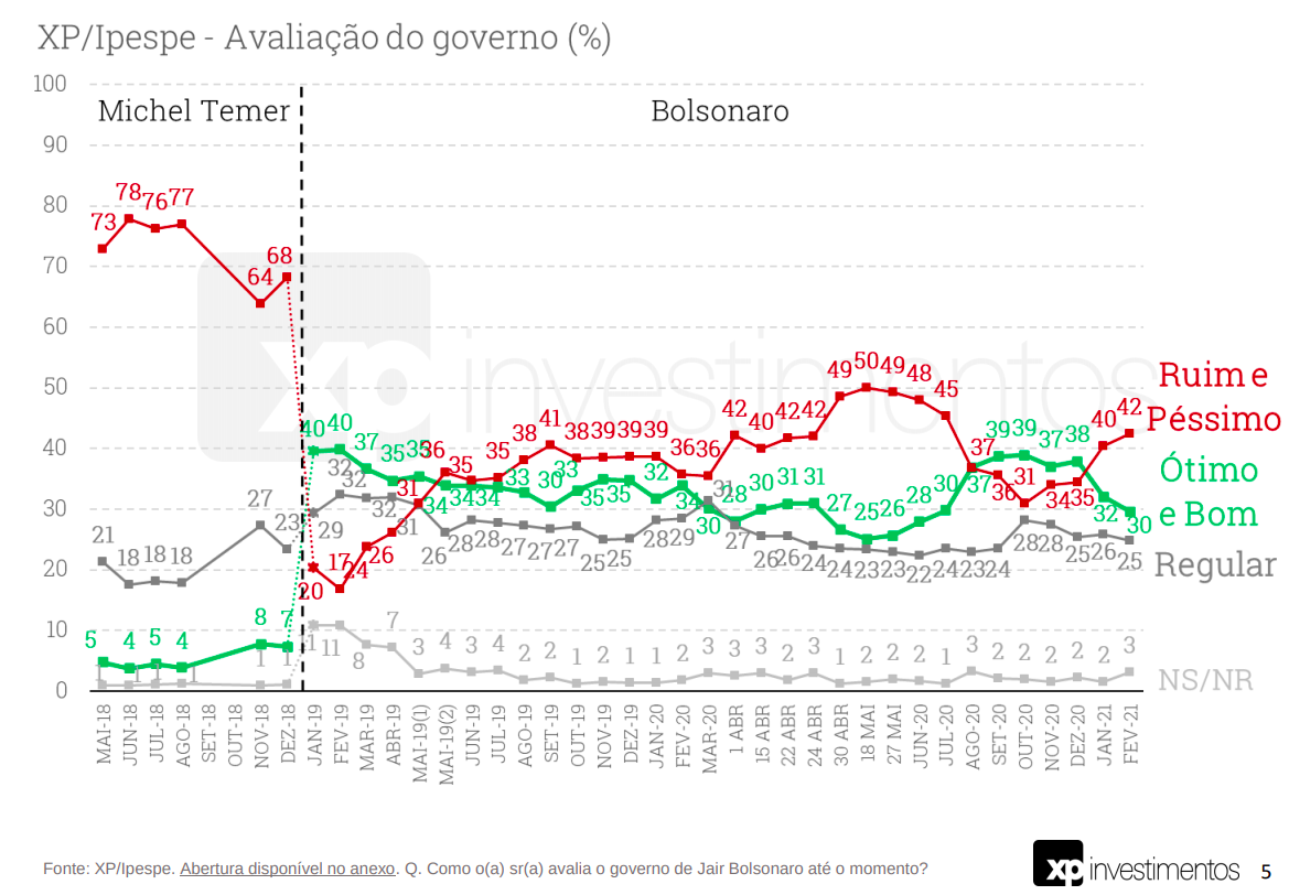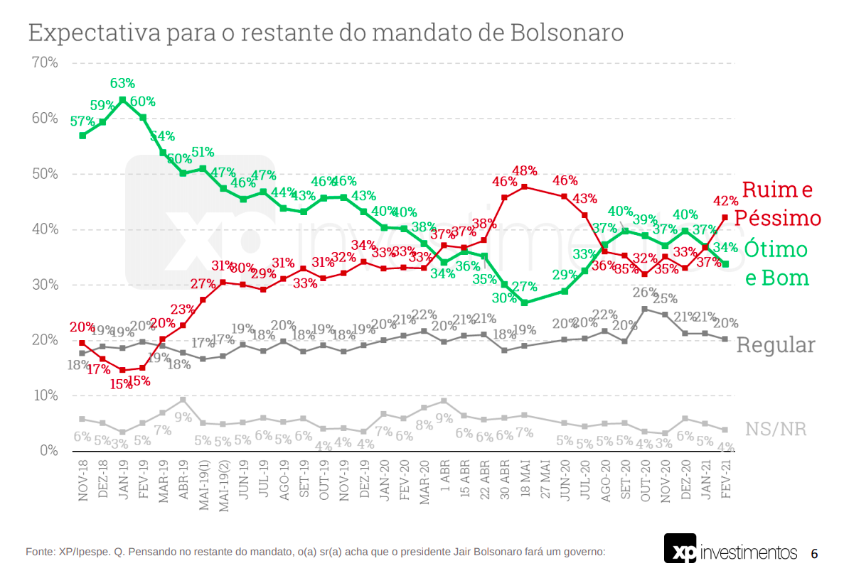 A nova pesquisa XP/Ipespe é muito ruim para Bolsonaro, embora os números ainda não apontem um cenário propício ao impeachment. O governo ainda tem 30% de ótimo e bom, o que representa uma queda expressiva dos 39% que ele chegou a possuir em agosto e setembro.
