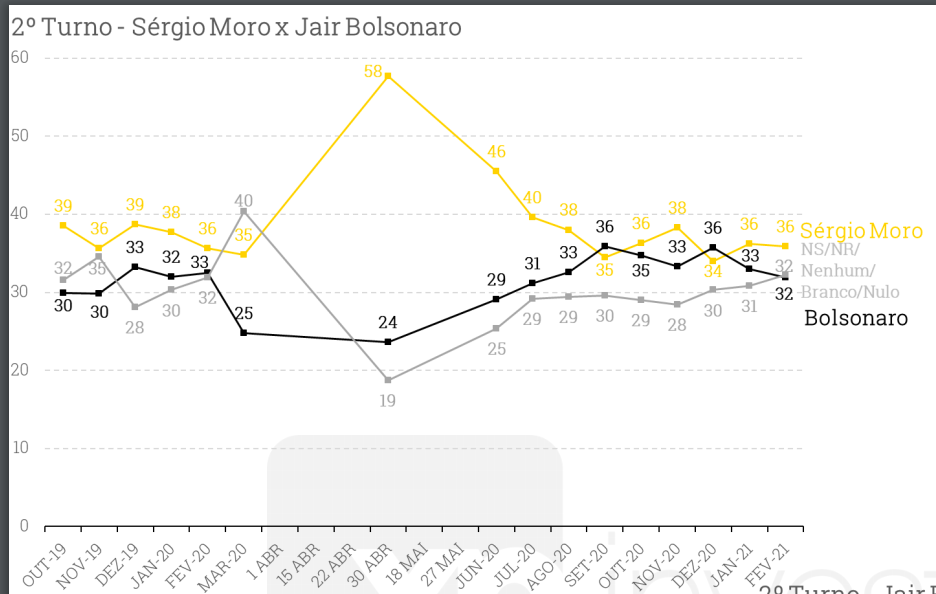 A XP/Ipespe também trouxe sete cenários de segundo turno. Bolsonaro ganha em seis, e perde de Sergio Moro. Mas tirando Moro, o candidato que tem o melhor desempenho é Ciro Gomes, que pontua 37%, empate técnico com os 39% de Bolsonaro (desvantagem de apenas 2 pontos).